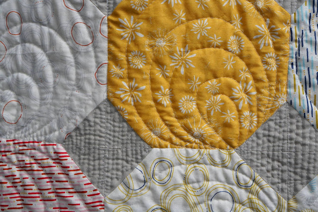 We had to take quick photos before I popped it back in the mail for the deadline (and it was windy that day, clearly - the quilt IS straight in real life!). Those hexagons have a movement of their own! Quilt it to life, right? You can see the movement of the quilting motifs on the back, too: