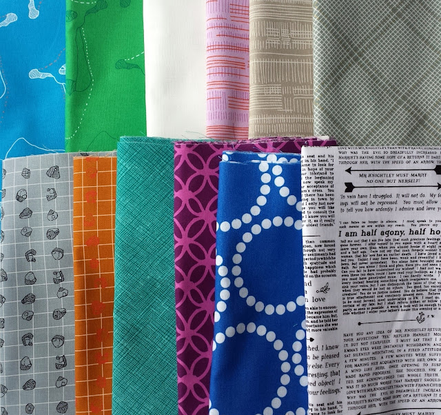 The three on the left, bottom row are extra purchases I used to round out my gift card money: Knotty in Grape from Macrame by Rashida Coleman-Hale (so me), Pearl Bracelets in Anchor by Lizzy House (a re-buy - color I love), and Austen Text in Black from Ardently Austen by the Quilted Fish (Pride and Prejudice is my favorite book, so this addition to my low volume stash was a must!!).