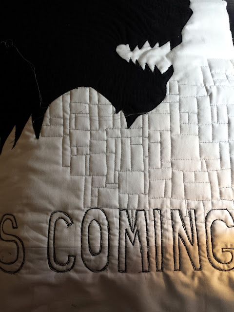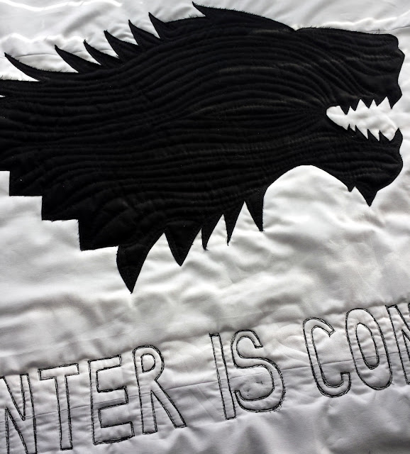 ReplyDeleteLUCKY brother! As a huge GOT fan, this wall hanging is such a great idea. I love how you've quilted the dire wolf's fur, and if it ravels, so much the better. Your background quilting reminds me of the ice on the Wall at Castle Black--genius! Winter is, indeed, coming :)