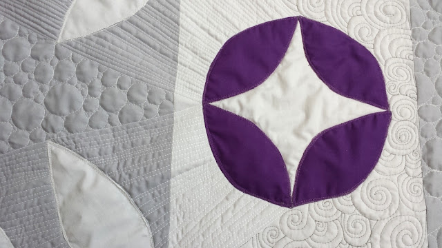 A thought: I've been making more solid-only quilts in the last couple of years. Maybe it's growing on me. Maybe I'm just imbibing the trend from the modern quilt world. I still LOVE prints, though, and combining prints and solids. Nevertheless, this quilt has made it into my top favorite makes because of the purple, simplicity, and the quilting opportunities.