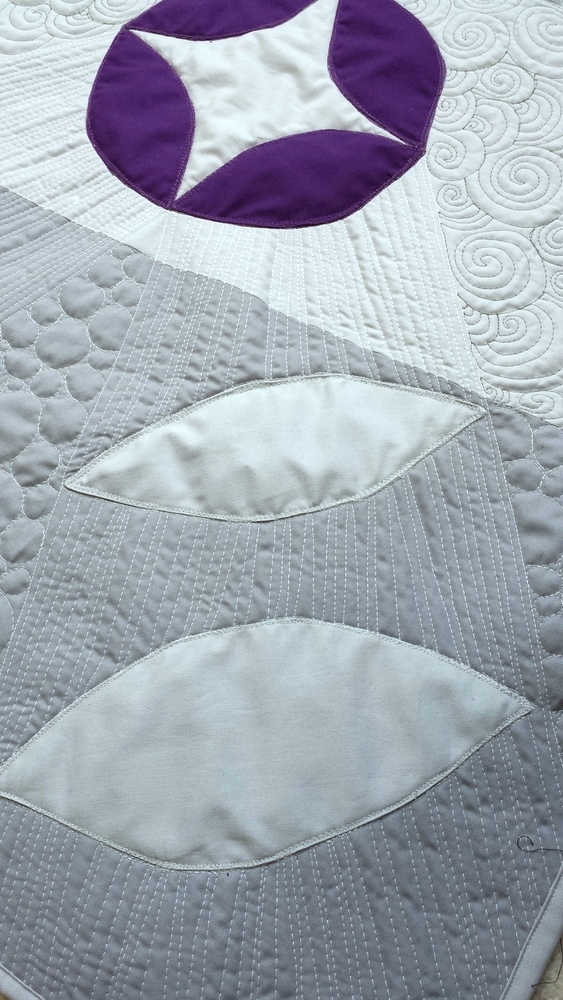 A thought: I've been making more solid-only quilts in the last couple of years. Maybe it's growing on me. Maybe I'm just imbibing the trend from the modern quilt world. I still LOVE prints, though, and combining prints and solids. Nevertheless, this quilt has made it into my top favorite makes because of the purple, simplicity, and the quilting opportunities.
