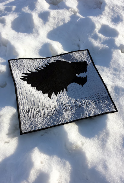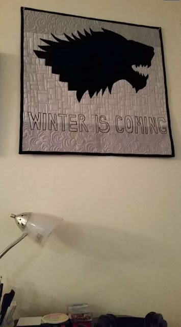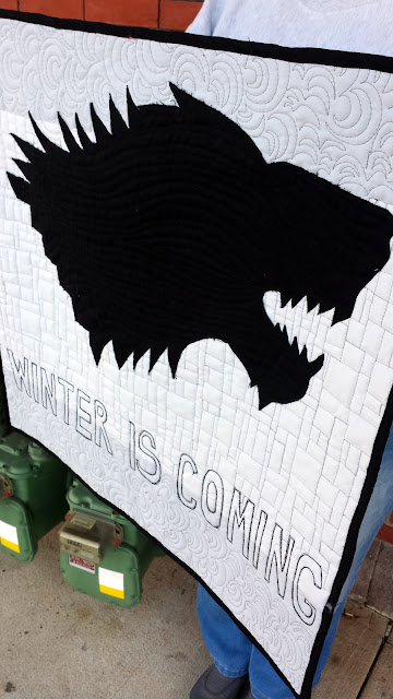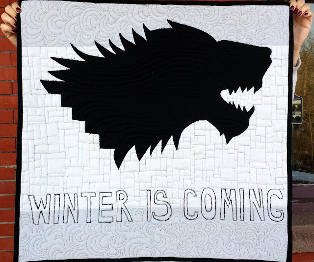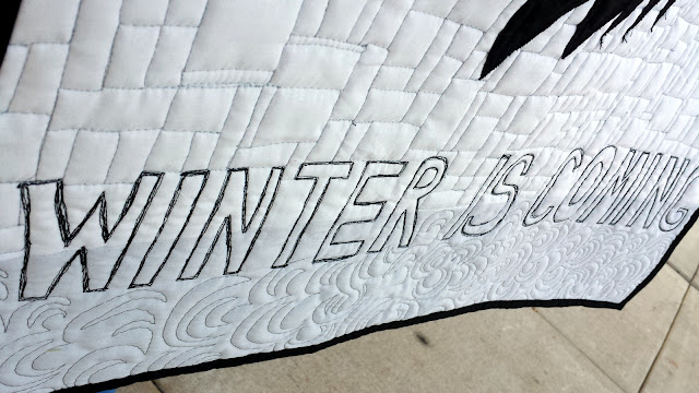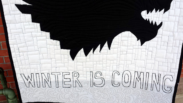 This quilt was made for my brother Sean's birthday upon his request. What really made this project fun is that I also appreciate Game of Thrones, its complex storyline, and actors (not so much the unending violence, though). Sean asked for the Stark family sigil (the direwolf) and the popular show/book catchphrase, "Winter is Coming."