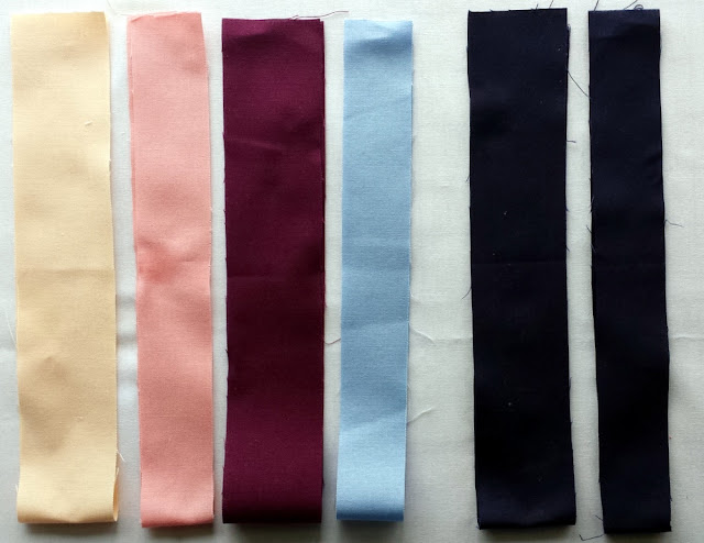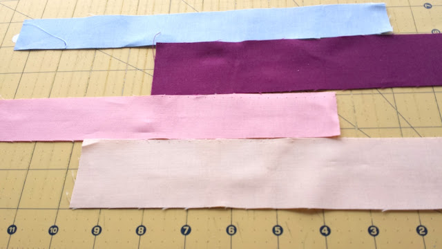 small dark blue pieces to your colored strips. It doesn't matter what side you sew the strips to because you can