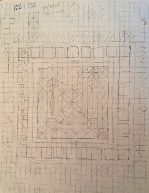 Here's the original sketch. The medallion is my original design, except for the very middle block (Ribbon Star by Fresh Lemons Quilts) and feathers (Feather Bed Pattern by Anna Maria Horner). The design morphed a lot as I went. I enjoyed making it up as I went and measuring only when I needed to. As you can see, I originally wanted orange peels in the middle (which I completely forgot about until seeing this again today!). Ironically, this was months before I even made my first orange peel quilt.