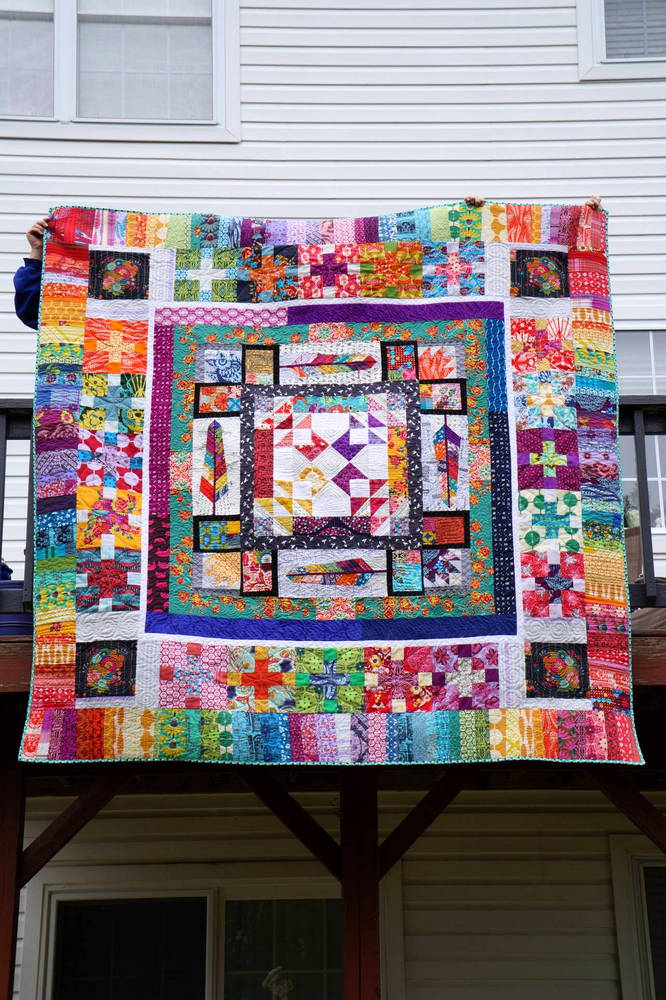 ReplyDeleteAbsolutely stunning!!!! the piano keys rainbow arrangement really draws your eye through the whole quilt. I also love the orange peel quilting on the plus blocks (it kinda makes them look like ghost x-plus blocks). Congrats friend, this is truly amazing.