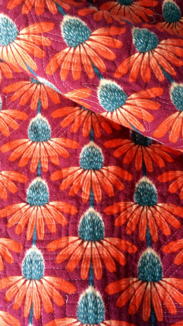 The back is Anna Maria Horner's Echinacea flannel in Boost. We have one quilt with flannel ("Allons-y, Allonso"), and it's the warmest/most comfy quilt we own. I've been planning for this print to be the backing since it came out a couple years ago! It's one of my all-time favorites.