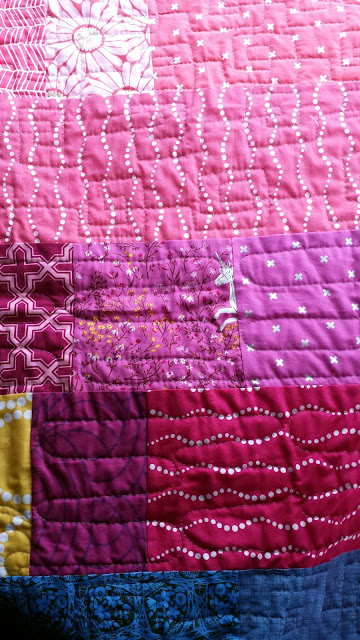 haha the picture of you peeking around your arm is just like the unicorn peeking on your quilt! I love how each row has different quilting, that would be such a fun way to play with new motifs and not get bored (like quilting 7 hours of swirl, ah mah gahd). I love your color and block placement in this quilt, especially the yellows! I am not good at using yellow.