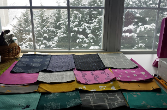 I started out by combining Imprint fabric by Katarina Roccella with Zephyr by Rashida Coleman-Hale. I love mixing fabric lines and I couldn't believe how similar the fabric tones were. I went with the bolder colors and took out any too-bright highlighter colors. Color choice takes work, but it's one of my favorite parts of the quilting process (next to the actual quilting).