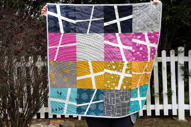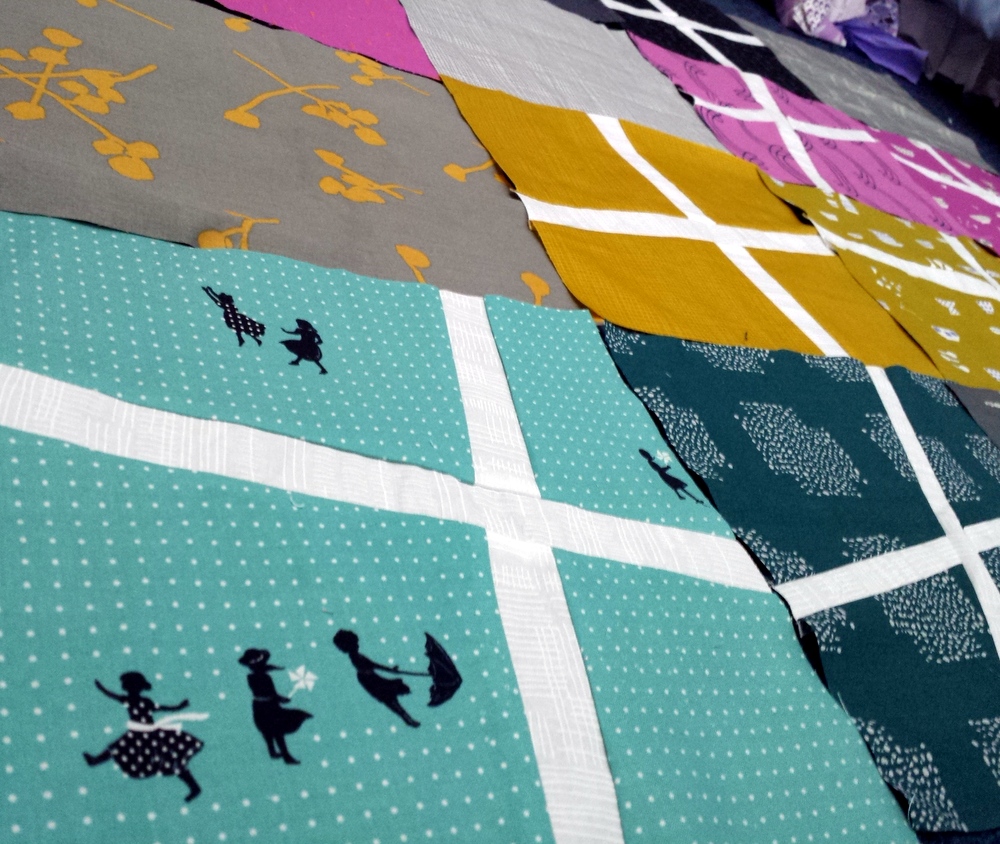 I started out by combining Imprint fabric by Katarina Roccella with Zephyr by Rashida Coleman-Hale. I love mixing fabric lines and I couldn't believe how similar the fabric tones were. I went with the bolder colors and took out any too-bright highlighter colors. Color choice takes work, but it's one of my favorite parts of the quilting process (next to the actual quilting).