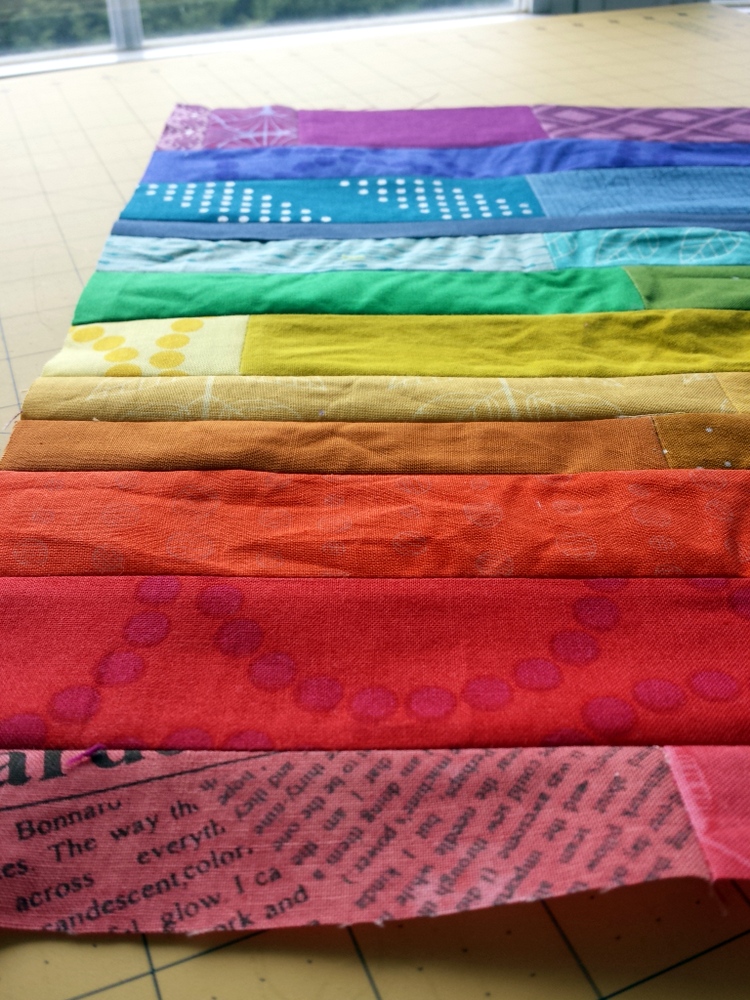 I am itching to finish and quilt this for the Rainbow Mini Quilt Swap at Mid-Atlantic Mod retreat in April. Whoever gets mine will be taking home a little bit of trademark me, plus some exciting quilting - can you guess what the next addition will be?
