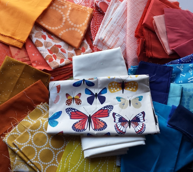 This fabric pull is for a new class sample for one of my next classes in development. The inaugural class is going to be held at a guild this summer (details tentative, but hopefully it will be finalized soon!). Those Lizzy House butterflies have SO many amazing colors!