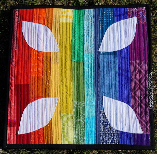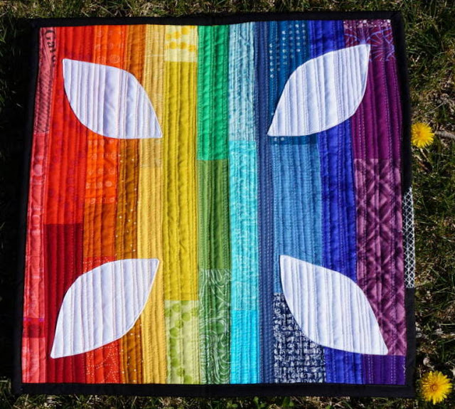The back of the quilt is a surprise for my partner. I hope s/he loves it as much as I do (because I really don't want to give it away - have I said that enough yet?!). Thanks to some chatter on Instagram, I decided on a black binding to make the rainbow POP! You can see many of the other rainbow mini quilts displayed on the #midatlanticmod hashtag on Instagram (click the link!).