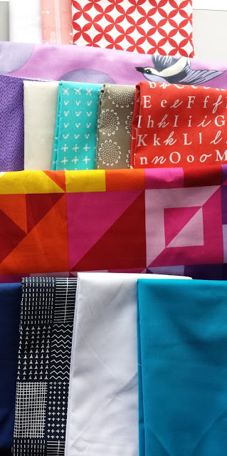 The top three are again some stash fillers, from The Old Country Store. I caved and bought a yard of that purple Tula Pink bird fabric at Burkholders - it's a wideback, so it's actually quite a large cut. I'd like to fussy cut at least one bird for my purple scrap quilt and use the rest as a backing. Underneath are more stash fillers from Burkholders (another good red fabric, we can't ever have enough good modern reds). And THEN, my friends, check out that half square triangle many-colored loveliness - that's Colorworks Concepts, Phase Two, by Deborah Edwards for Northcott. See the whole thing right here - AHH! I think I bought two yards. That's definitely backing material. Finally, the bottom fabrics are for an exciting, secret project!
