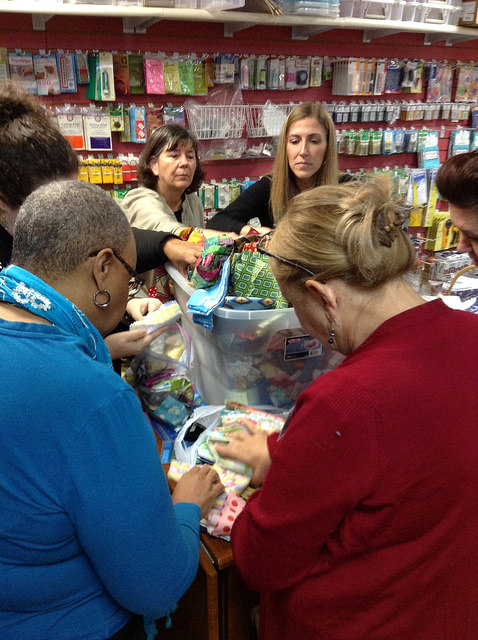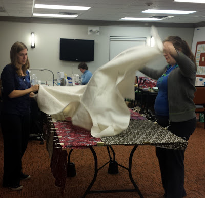 I was definitely wearing fuzzy socks here (this is from our annual November guild retreat in 2014). Yes, they get dirty, but that's what washing machines are for!