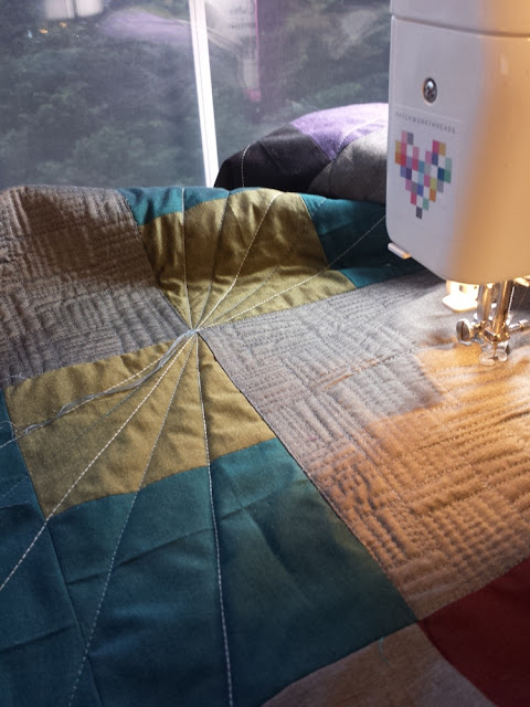 "Works in progress" is the name of the game right now around here. If you took a stroll around my sewing room (which would be near impossible, by the way), you'd see 3 quilts in piecing action, 3 waiting to be quilted, 1 half quilted, 2 piles of fabric in project development, 1 giant box of purple fabrics set aside for my scrap quilt... you get the idea. It's a little chaotic here, but I'm totally in my game. I THRIVE when I'm working on a thousand things at once! After all, there's always something to work on, no matter what time of day or mood I'm in.