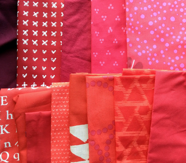 We'll examine the dark reds first. I decided to supplement my FQ bundle from Fat Quarter Shop with more fabrics from my stash. The top row contains deep reds, and the bottom is tomato reds.