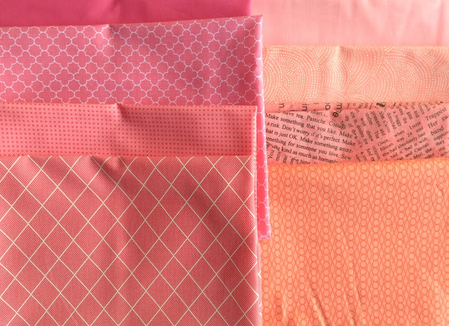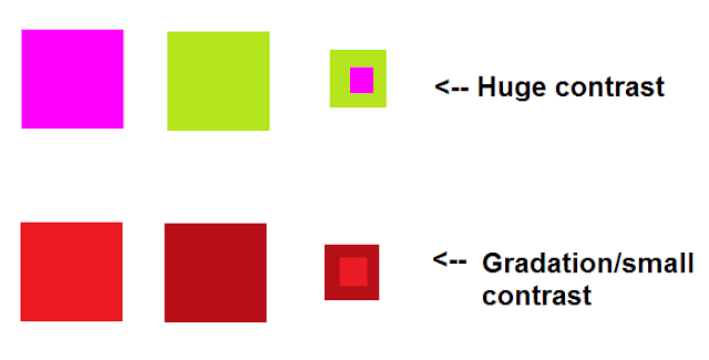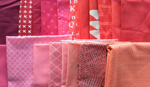 These are my thoughts based on years of working with various colored modern fabrics and making this quilt. Hopefully this post will help you think about how you will pair your fabrics together when we start cutting. Feel free to comment if you have any tips or questions!Contrast is, at its simplest, when one color appears brighter than/sticks out against another. Now, pitting two very different colors against each other is easy enough. Think light pink against bright green (HUGE contrast , below). But what if you're making a quilt (like this one) where you are creating contrast WITHIN the same color? This is called gradation.