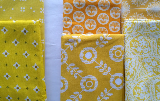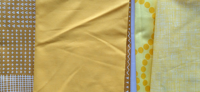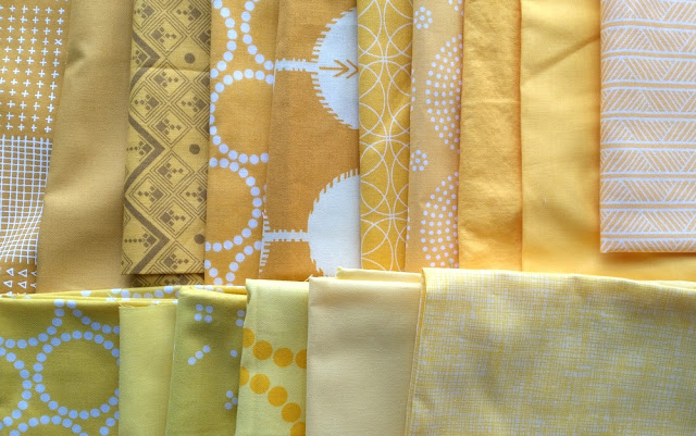 This middle solid yellow below will be a perfect large star, and the left mustardy fabric with the white print behind it (from Blueberry Park by Karen Lewis) will be an awesome background (or vice versa). Similarly, the fabrics to the right are both light, lemony yellows, but they make a great contrast due to their differing values and print size/scale.
