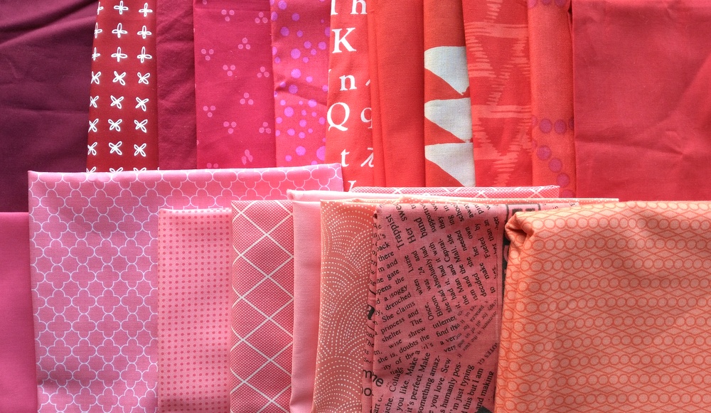 We'll examine the dark reds first. I decided to supplement my FQ bundle from Fat Quarter Shop with more fabrics from my stash. The top row contains deep reds, and the bottom is tomato reds.