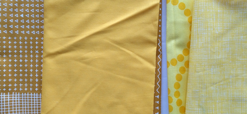 This middle solid yellow below will be a perfect large star, and the left mustardy fabric with the white print behind it (from Blueberry Park by Karen Lewis) will be an awesome background (or vice versa). Similarly, the fabrics to the right are both light, lemony yellows, but they make a great contrast due to their differing values and print size/scale.