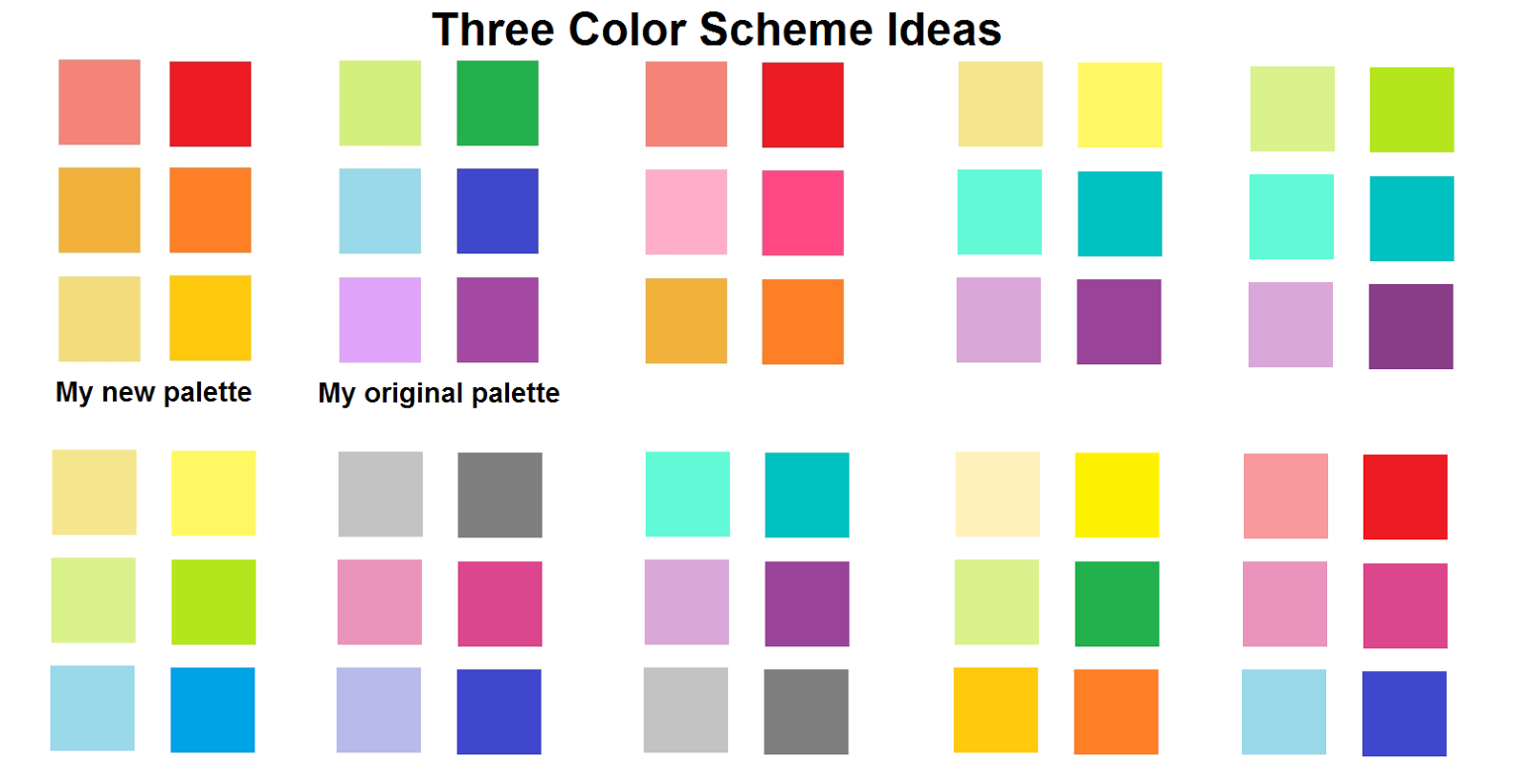 Here's how I separated my yellows: mustard on top for one block (dark yellow) with bright, lemony yellow on the bottom for the second yellow block (light yellow). You'll notice there's a great range here in terms of saturation (color intensity); this will allow me to really contrast within the dark and light blocks.