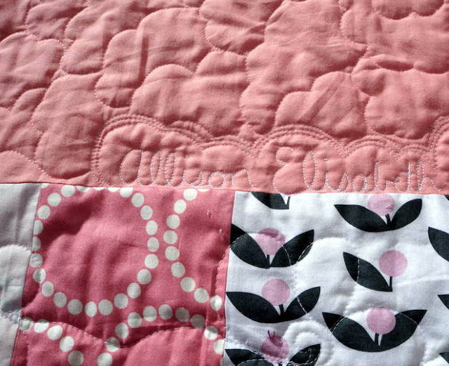 The borders, which were assembled using most of the only light pink fabrics I have, were quilted with an easy loopy flower design that Jess @jtlevitt helped me pick out. Finally, I HAD to quilt the baby's name into the bottom right corner of the quilt! I love how Sarah spells her middle name, and I love that I got to use free motion quilting to truly make that quilt Allison's.