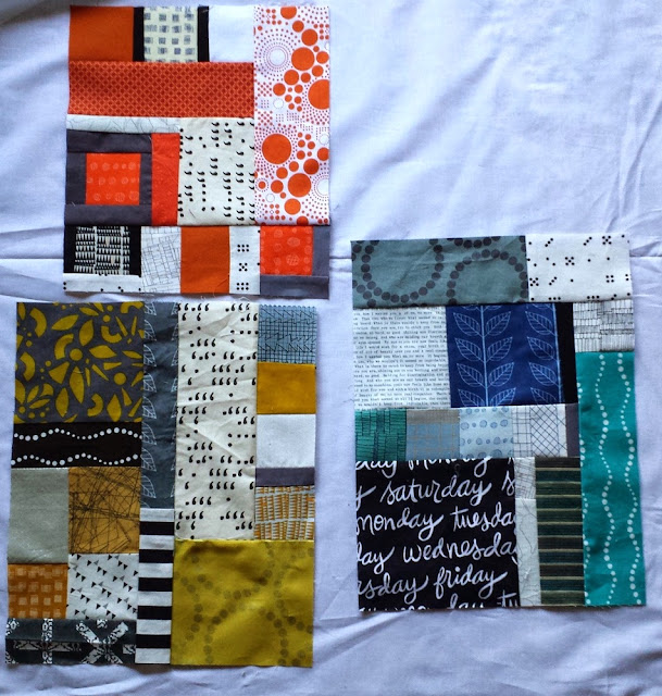 I wrote about this process here and there on the blog, but it was scattered, so I'll add in some more details now. I took the mini charm squares and improvisationally pieced together blocks that were based on those colors. I made sure to include pieces of white and black in each block (one of my techniques for structured improv is following a stipulation). Only within the last couple years have I started using strong colors like black in my piecing (and I love the effect!). I really had no idea where this quilt was going, but I knew it needed something more (similar to the beginnings of my Pebble Cascade quilt).