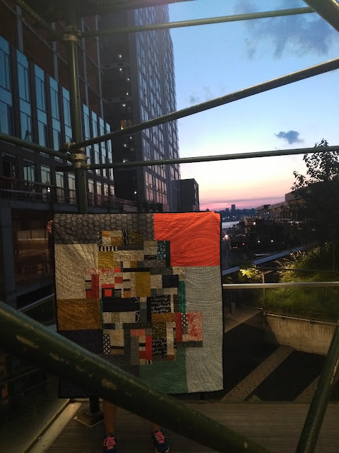 The picture below was all luck! We were on the High Line (if you've never heard of it and you're going to NYC, you won't be disappointed; it's a beautiful, elevated park that spans a couple miles of western Manhattan). We caught the last few minutes of a lovely sunset. I love how Marisa captured the quilt within the bars - so industrial looking, kind of like the quilt itself. By this point, we were absolutely exhausted from our day in the city.