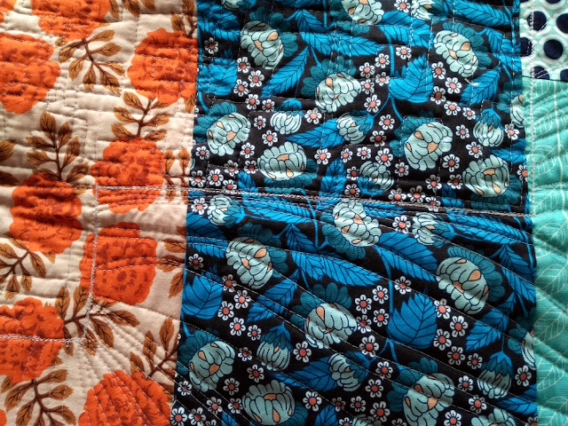 For the backing, I pieced together two colors that go well together (orange and blue). I wanted to use up some of these fabrics. You can also see where I outlined the improv piece on the front with white thread to make it "pop" even more!