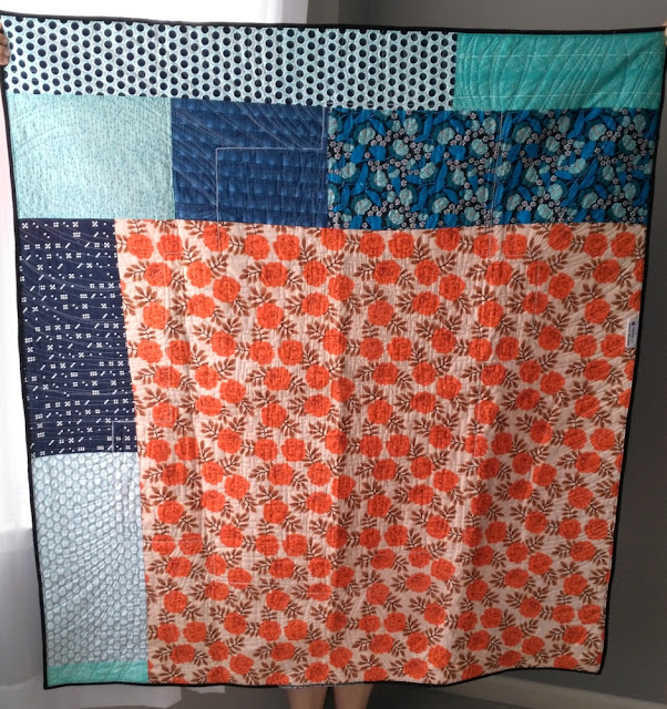 I decided to piece all of the blocks together and surround them with something. But what? Instead of making the big improv piece float in negative space or one solid color, I decided to "go bold" and use several different prints. I tried to place the background fabrics opposite of where they were featured in the middle (orange far away from orange, for example). This kind of quilt was difficult to imagine until it was done, but I think this technique established color balance.