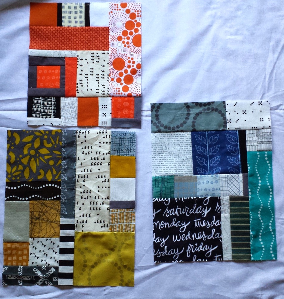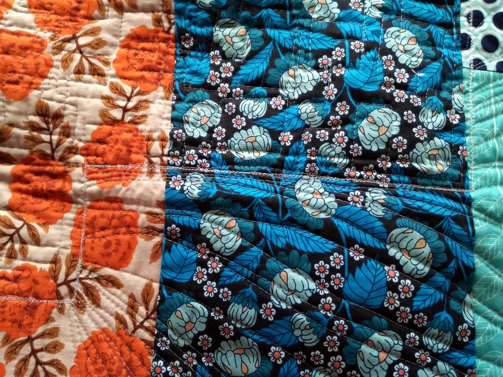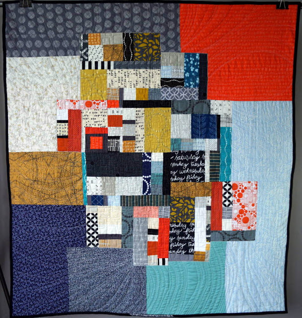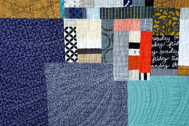 I decided to piece all of the blocks together and surround them with something. But what? Instead of making the big improv piece float in negative space or one solid color, I decided to "go bold" and use several different prints. I tried to place the background fabrics opposite of where they were featured in the middle (orange far away from orange, for example). This kind of quilt was difficult to imagine until it was done, but I think this technique established color balance.