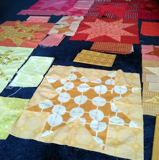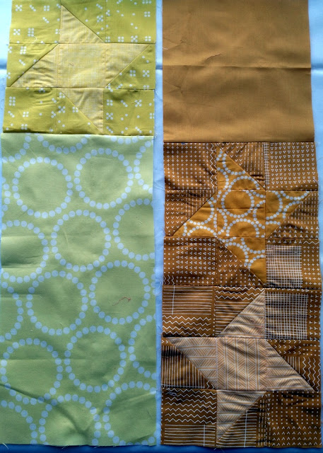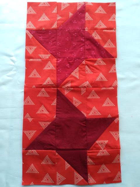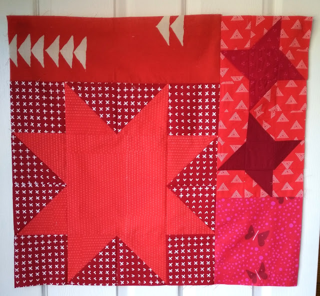 4. Sew the two sections of your block together (see below for a full block), and press the seam open. This is just ONE option for a layout! Feel free to experiment with the placement of your stars and background fabrics - see last week's post about Alternate Gridwork for more layout ideas. Repeat directions 1-4 for all of your large blocks.
