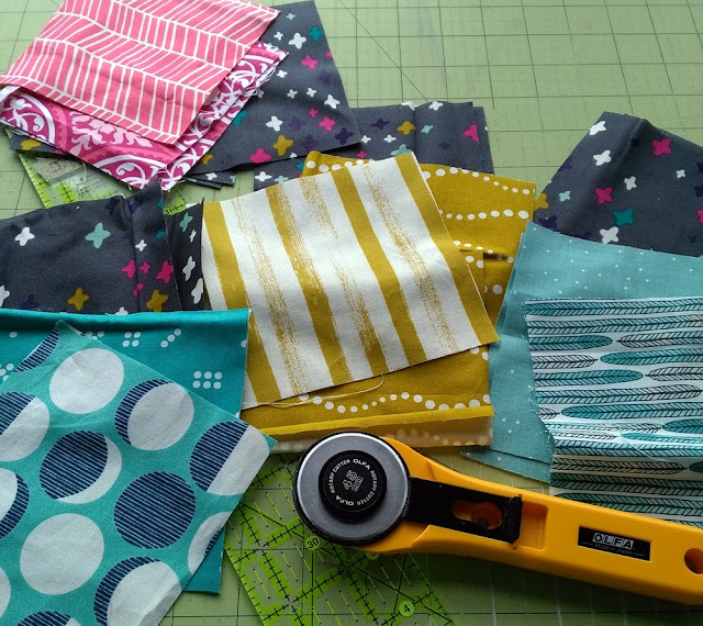 She loves mini quilts and bright colors, so I started with the below beautiful plus fabric ("It's A Plus" from Koi by Rashida Coleman-Hale, which I've luckily hoarded, as it's long out of print). I pulled colors from my fabric stash that matched (or closely complemented) the pluses.