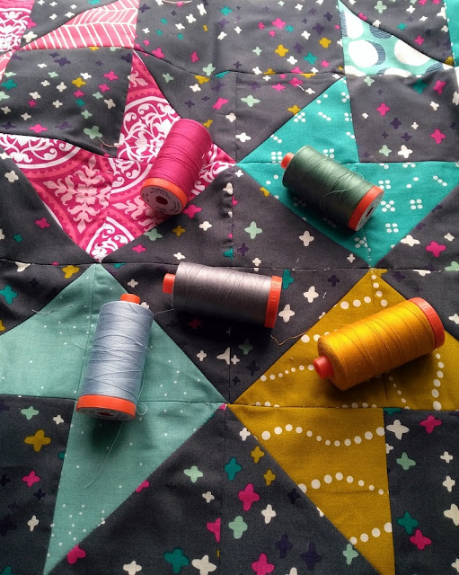 I used the following Aurifil colors to blend with or slightly pop against the fabric: 1100 (magenta), 2135 (yellow), 2850 (green), 2710 (light blue), and 5004 (dark gray).