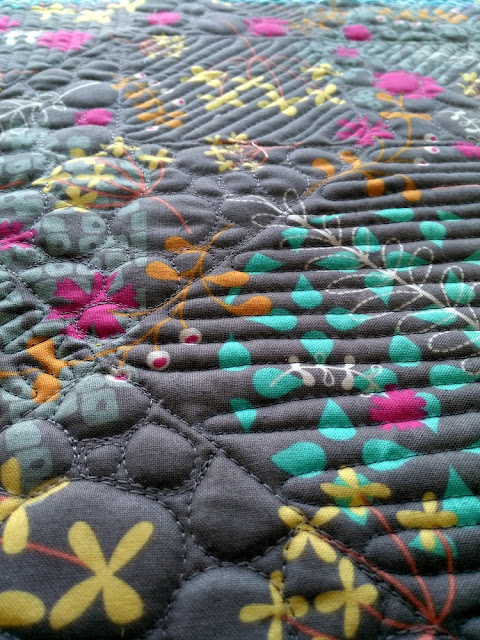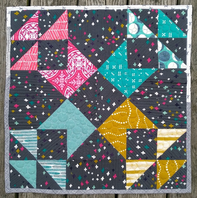The background fabric works so well with the colors you picked! I think that a mini quilt is such a thoughtful thank you gift, and I am sure it will brighten where it is kept. :)