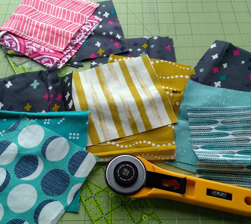 She loves mini quilts and bright colors, so I started with the below beautiful plus fabric ("It's A Plus" from Koi by Rashida Coleman-Hale, which I've luckily hoarded, as it's long out of print). I pulled colors from my fabric stash that matched (or closely complemented) the pluses.