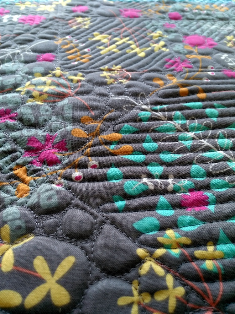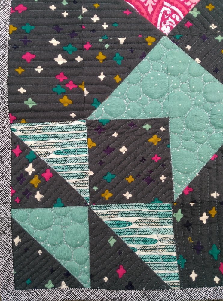 Upon finishing, I reflected about how awesome it is to make mini quilts. You can try out a big idea on a small scale. You can quilt them really densely without worrying about much wear and tear or washing. You can make something special for someone that takes much less time (and money) than a large quilt. It can be apart of their decor or table or sewing room for years to come! Thumbs up, mini quilts.