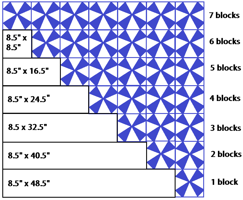 *You will need to sew some of your 8.5" strips together to achieve the lengths described. Instead of precisely cutting all of your solid strips, you may just want to leave them longer than they should be, sew the top together, and then trim it down. Much less to worry about!
