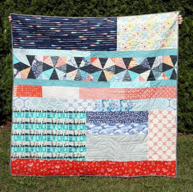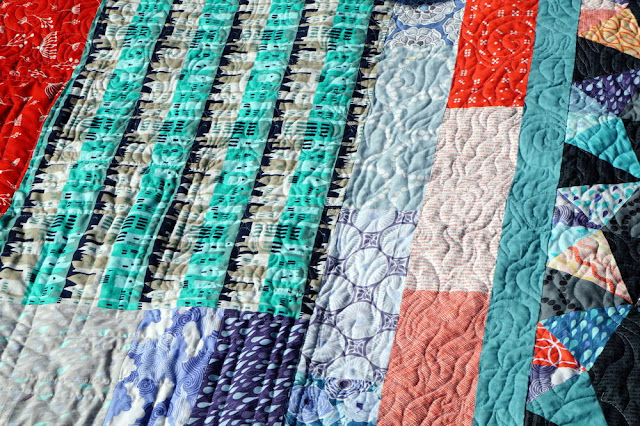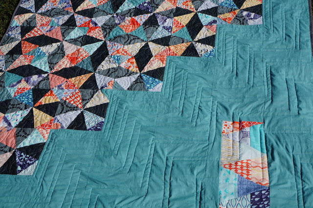 I quilted this quilt with design in mind; the negative space is emphasized by step-like quilting. I used my walking foot for that part. I could have added even more lines but I'm happy with the minimalistic look. I forsook using a guide other than the seam lines because I love to just "go for it" (as I mentioned above). Why mark out quilting or use a guide when you can just let it happen, knowing it will still look great? I always encourage my quilting students to let go of inhibitions because that's the best way to get better (in my opinion!).