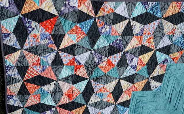 On precise-ness: this type of pattern is usually very exact, so as to show the progression of the kaleidoscope across the quilt. I am the first to say I am not a precision sewist. I CAN sew with precision (and always do for commissions), but often, on my own projects, I choose not to. Why? Because I find it more fun that way, and I like the "wonkiness" that comes from improvisation and seams that don't line up exactly.