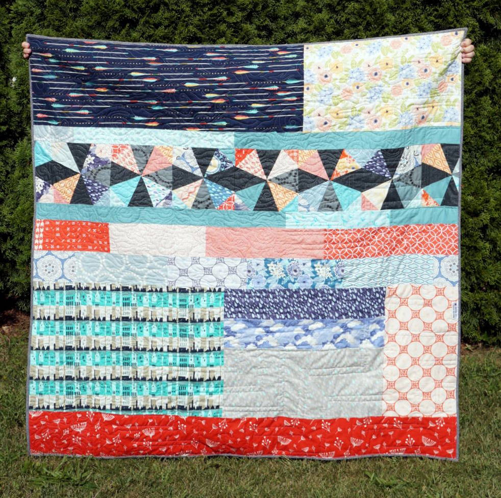 On the back, I threw in several extra blocks I had made, combined with coordinating yardage from my fabric stash. Pieced backs are my favorite! I used up several large scraps and pieces; somehow it all works together. This could be a quilt in its own right!