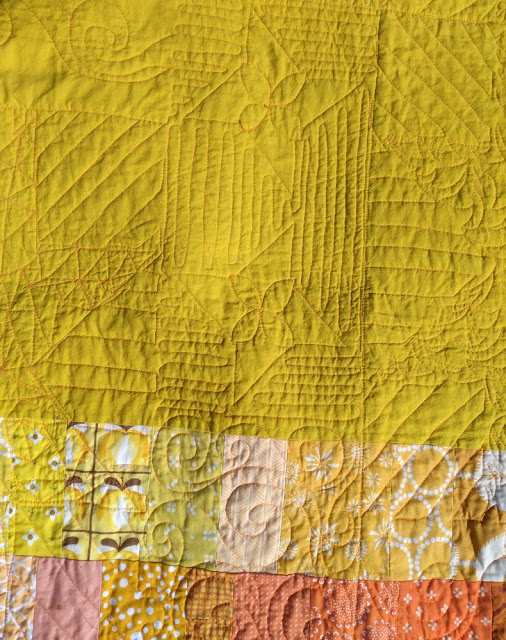 I pieced together lots of scraps from the front and a lovely yellow, Sprout Cirrus Solid, for the backing. The minimalist approach and lightening effect made me more happy that I can say. It's totally reversible, bright, and happy.