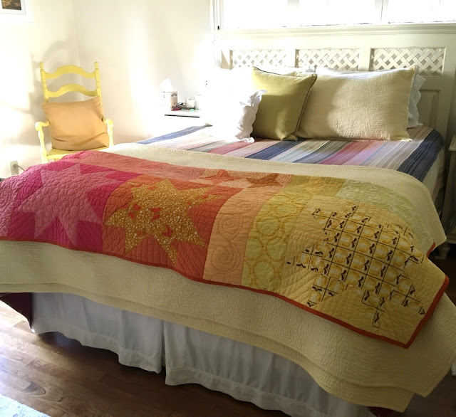 Look, it's in its forever home now, and I couldn't have planned it better myself (I DID NOT KNOW it would match their room - like, look at that chair!!). This quilt now lives with my aunt, uncle, and family, who just moved to CA. I hoped it would fit in, and I'm happy to say they are thrilled with it!!
