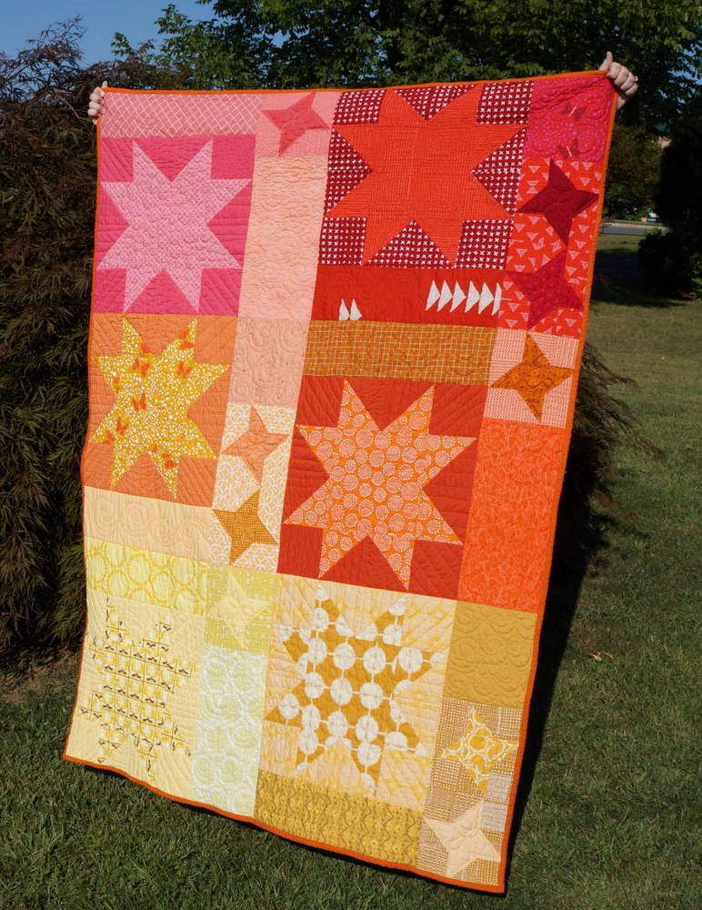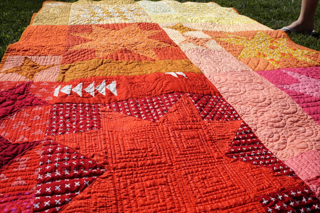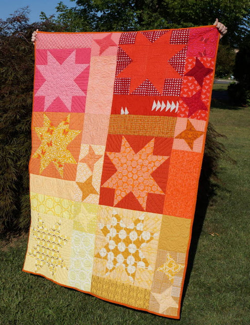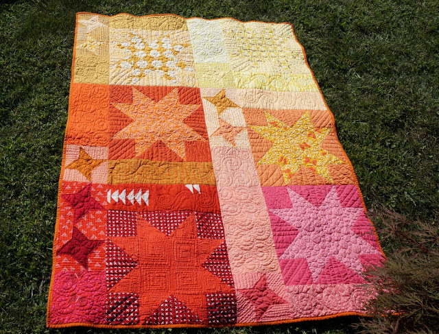 I'd like to share my finished quilt (the second one!) - officially called "Ablaze." I quilted this one very in-depth; each large star features a different filler motif, and I used lots of organic lines and swirls to add dimension to different parts of the quilt. Many of the stars look like they pop off the fabric. You can see more close ups on last week's quilting suggestions post, if you're interested!