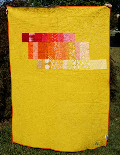 I pieced together lots of scraps from the front and a lovely yellow, Sprout Cirrus Solid, for the backing. The minimalist approach and lightening effect made me more happy that I can say. It's totally reversible, bright, and happy.