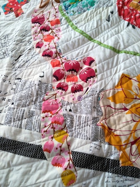 My favorite section of the quilt is the one below, where I appliqued two different colorways of the "Summer Totem" print from Loulouthi (my favorite fabric EVER in the history of the world). This part really conveys the "trellis" image. Plus, the Pride and Prejudice text print in the background (from Ardently Austen) is one of my favorite low volume/text prints!