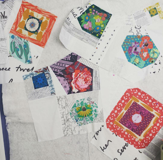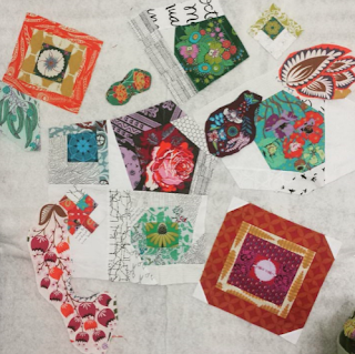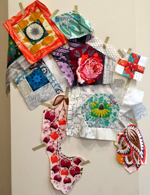 The concept behind Trellis began when I gleefully signed up for Anna Maria Horner's "Mod Corsage" workshop at QuiltCon 2015 in Austin, TX. Readers might already know how much I love her fabrics and admire her as an artist and teacher. Anyway, the premise of the class was making tons of different flowers. I learned a lot about fussy cutting, how her fabrics are strategically made, needle-turn applique, and piecing flowers. I wrote more about the class here if you're interested. I ended the day with a bunch of pieced flowers and possible leaves: