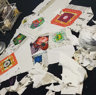 The piecing process was drawn out and interesting, to say the least. My design wall and floor were very handy. Here are some progress shots of lots of low volume, random curves, and partial seams. Just some of the flowers are appliqued; the background is completely pieced. Somehow it all came together over a year and a half; it was frustrating at times and I had to put it away often. I honestly didn't know if it would get finished this year... but it did!