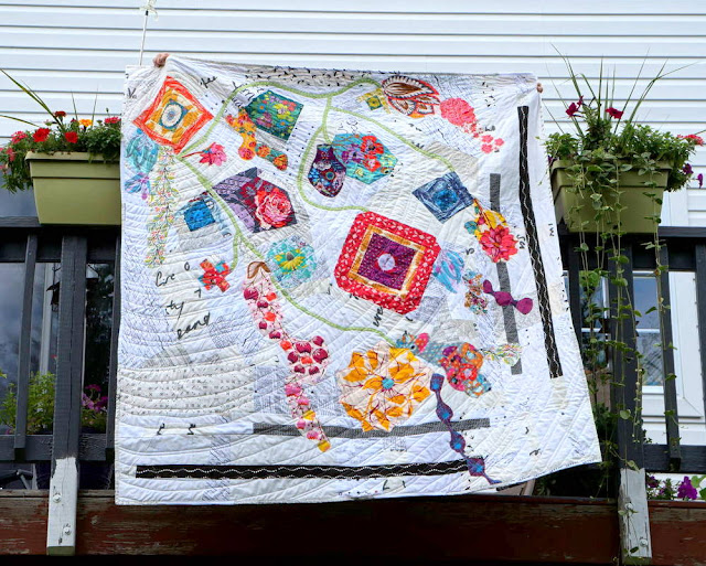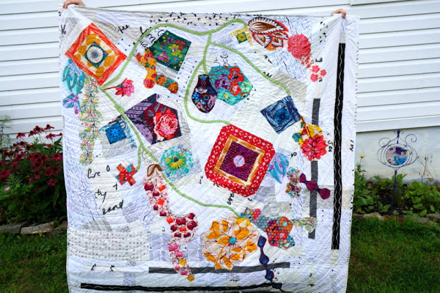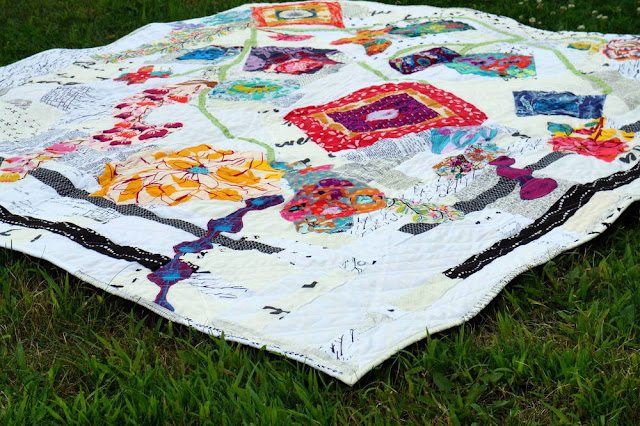 Eventually, I decided to add two black bars on either side of the quilt to suggest a garden gate. Hopefully, the flowers would flow over it! It's abstract but I like the depth it provides. I eventually ran out of steam while machine appliqueing flowers and the quilt became much larger than I originally imagined, but I'm very happy with the final look!