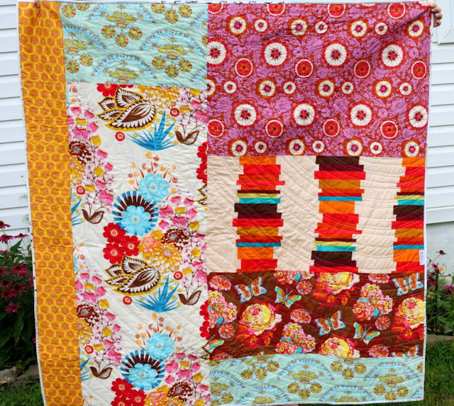 ReplyDeleteTerrific quilt--quite an accomplishment! It's very light-hearted and free form--I love the lack of straight lines for a change. I'm curious--why walking foot quilting and not FMQ?